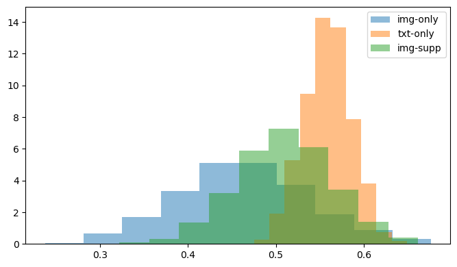 Selecting InternVL as our main VLM, we compare facts supported by images to facts supported by text using a larger set of images and facts as input. Figure 3, below, shows that, for 328 facts extracted from CrisisFACTS-001-r2, the average imputed priority score for facts that are supported only by images is significantly lower than facts supported by either text alone or a combination of text and images. More specifically, Figure 3 shows bootstrapped mean importance scores for 36 facts supported only by images, 292 facts supported only by text, and 71 facts supported by both modalities. Extending this analysis to 8,455 images and 912,960 text-based messages across all 18 CrisisFACTS events, however, we see a different result in that, on average, images have a higher per-event-day importance (0.4745) versus text (0.1398). These measures are before summarization though, as we are still working to run the full pipeline across all events and resolve facts across modalities.