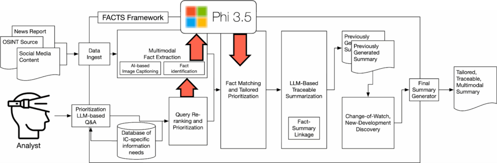 Our foundation for this work is the FACT Framework, as outlined in Figure 1. This framework consumes data from multiple online information sources and modalities–images and text pulled from social media and news–along with a preset collection of task-specific queries to produce tailored, traceable, multimodal daily summaries. FACTS maintains separate pipelines for text and image data, allowing for us to, in parallel, extract relevant facts from images via a VLM and use standard text-retrieval algorithms to identify relevant textual content. This process produces a uniform collection of textual facts along with a link to the original text/image-based message from which that fact was extracted. We then merge the resulting fact set to aggregate similar facts into a smaller collection of “meta” facts, where each meta-fact can be traced back to one or more pieces of original content. For each of these facts, the framework leverages several thousand pieces of labeled content from prior crisis-informatics work to infer its importance for a crisis-response stakeholder. The FACTS framework then re-orders these meta-facts based on this priority and relevance to the set of user-provided queries to produce its output summary for a given day. In future iterations, we will compare these daily summaries to identify which facts are new developments in the event and should therefore be surfaced first.